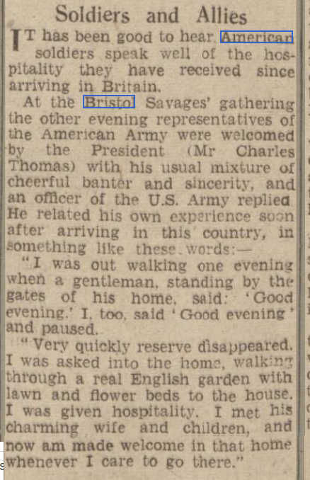 Bristolians were keen to show their appreciation that the U.S.A. had joined the war and their young men and women were in the city. From this article, it’s clear that many G.I.s appreciated their hospitality especially when invited into private homes.
