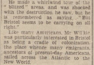 The first important visit of an American to Bristol during the war was from Wendell Willkie, The recently-defeated presidential nominee, landed at Bristol Airport in February 1941. He arrived as part of his mission to get the U.S. to give England “the utmost aid possible in her struggle for free men all over the world”. He flew onto London but on his return by train was keen to see war-torn Bristol.