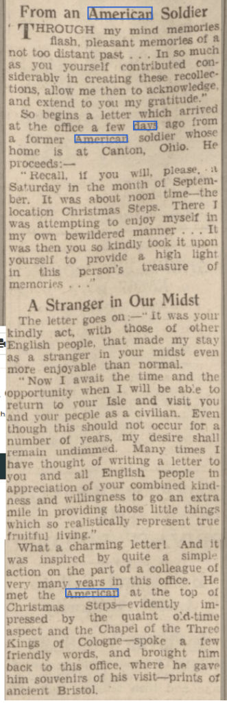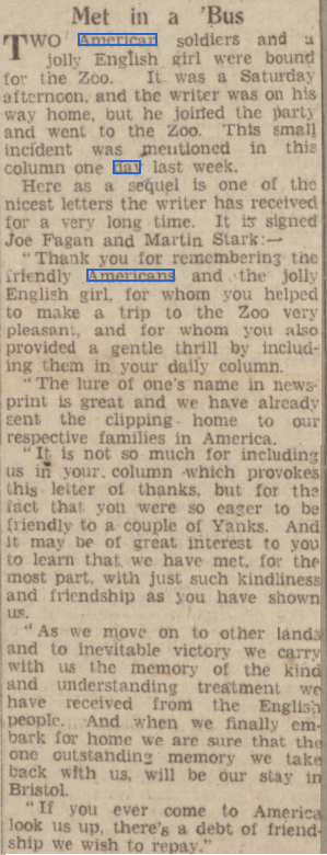 The appreciation of Bristolian hospitality continued from the American personnel after D-Day and a real affection had grown for their hosts as this rather innocuous but charming story demonstrates: