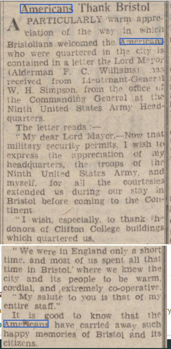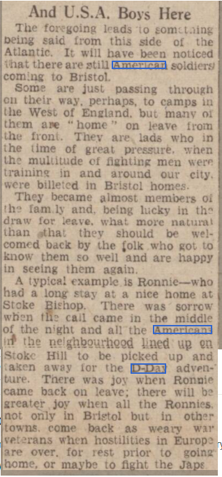 Camps had sprung up all over Bristol (see locations) but NCOs and officers in particular were billeted in the spare rooms of Bristol’s private houses (here’s one account). Understandably, many households were not keen at first to house strange men but, in many cases, close friendships were made. Of course, there was no reporting of animosity in the papers and it was only referred to after many Americans had left for D-Day as this moving piece demonstrates: