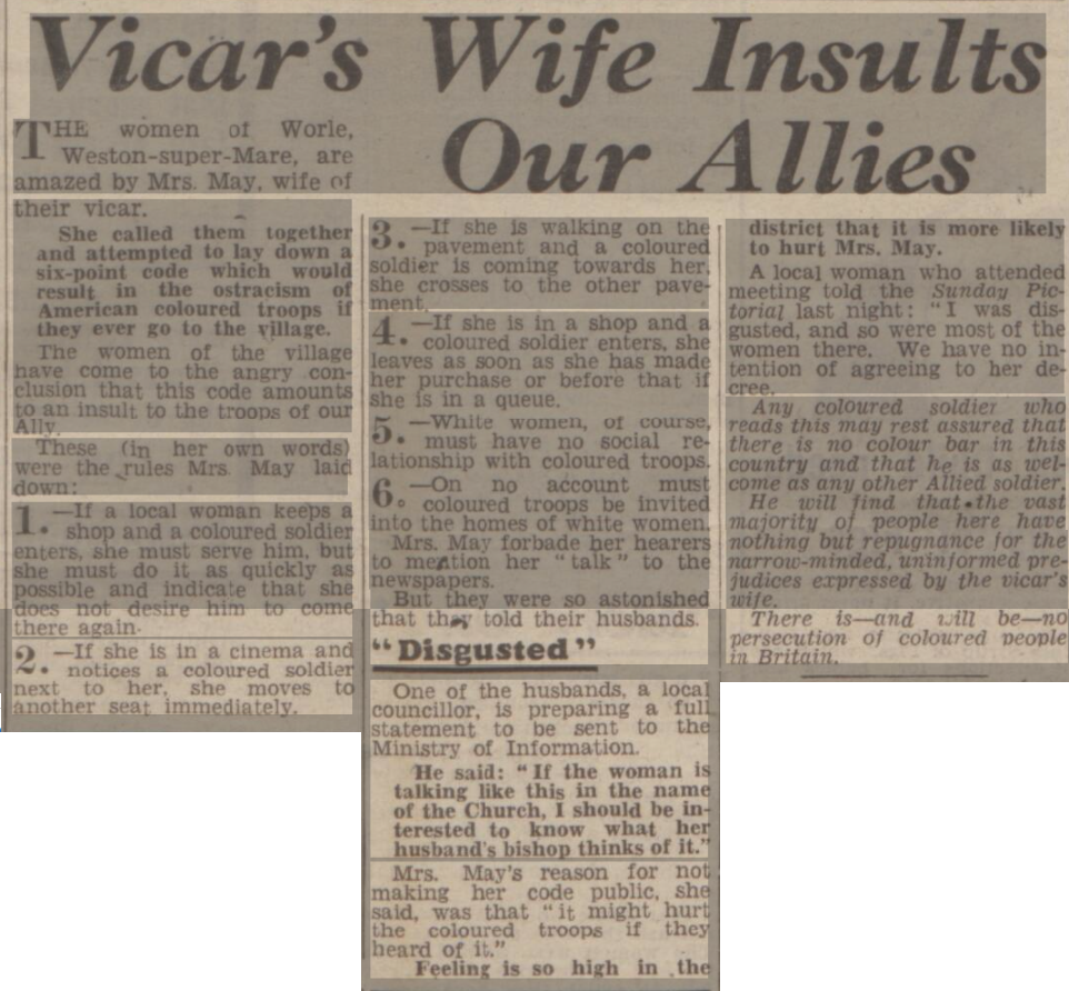 The press seemed to make a special effort in showing black GIs that they were particularly welcome in Britain (When Jim Crow Met John Bull by Graham Smith gives a comprehensive account of the conflict between British and American race relations in the Second World War). In one much-quoted example, a vicar’s wife near Weston Super Mare tried to stop her female parishioners from mixing with African-American soldiers but the locals refused to comply.