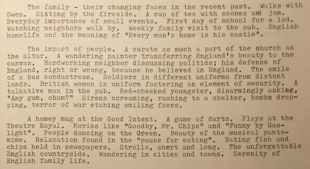 Nell Wilson showed him to his room. “It was small, on the second floor, bare with the exception of a cabinet for my clothes”. Shortly after, “a voice called and asked if I would care to have ‘a spot of tea’”. Tea had been delayed so he could meet the rest of the family: husband Roy (“former soldier with a military air”); Jean (“a lovely girl of twelve”) and Bryan (a lad of five)”. They chatted “aimlessly about a thousand items of trivia; life in America” and many other topics. He was asked to join them at supper at 9pm but declined “remembering the shortage of food for English families”.