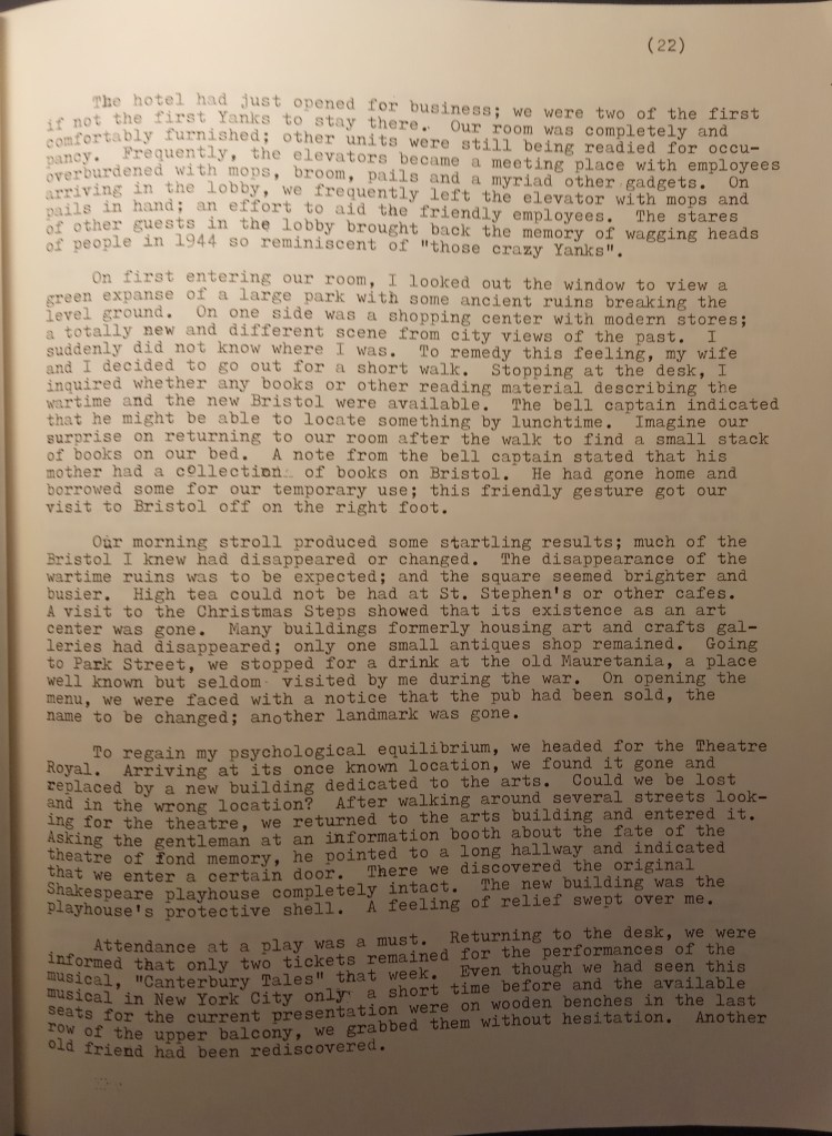 “What of recreation?” asks Eugene. “Visiting Bristol became a frequent pleasure. The ride of the two-decker bus was an opportunity to view from its upper deck the diversity of the old city – old townhouses, streets of narrow row houses, industrial plants near railroad storage areas, pubs, quiet parks, all composing a kaleidoscope view.”