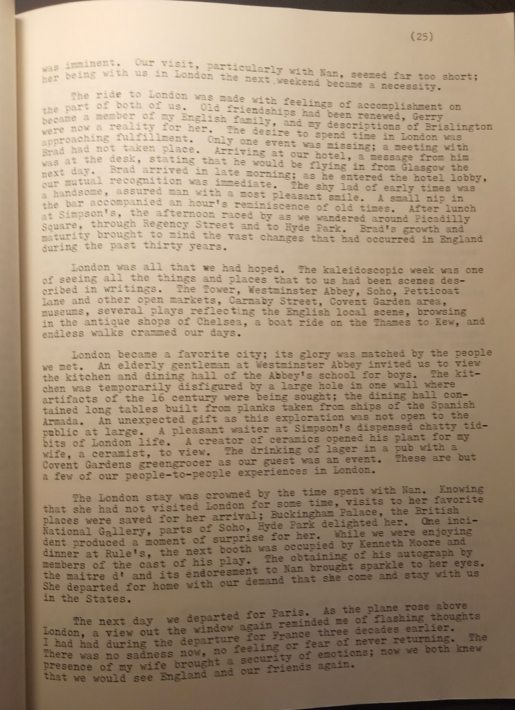 A routine was soon established: “Within a short time, I found myself coming home nearly every evening. Unless I was on duty or otherwise occupied, the family waited dinner for me if I was late. We gathered near the fireplace, the only room heated due to the shortage of fuel. The meal was served. As I had eaten earlier at the army mess hall, I had only a ‘spot of tea’ and sometimes a touch of dessert. It was difficult to believe I had left the States and was still in the army; I felt at home.”