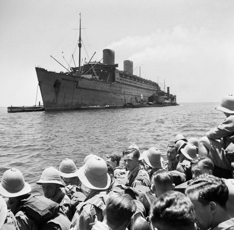 Upon completion of training, he set sail for Britain on 25th November 1943 on the Queen Elizabeth with 14,000 other men on a five-day voyage across the Atlantic. Being a British ship, it was his first experience of English cooking “it was soft, everything seemed to be boiled!” They queued for two hours, ate then got in the queue for their second meal of the day. Going overseas he told a psychologist he was ready but later admitted “I was one scared kid”.