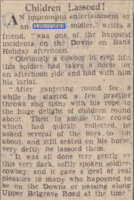 Perhaps the most exciting and exotic piece of entertainment that Americans brought was a cowboy display! The Downs, used as a US Army vehicle storage and servicing area, was the scene of bank holiday fun.