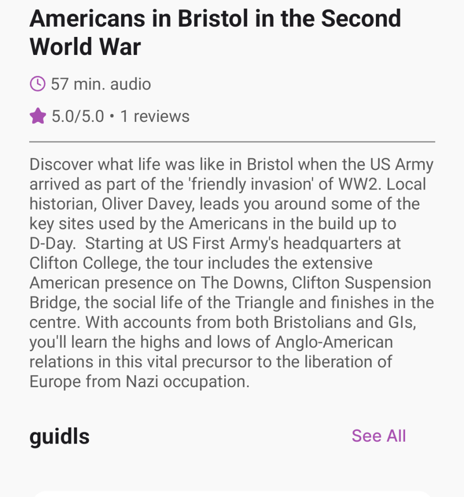 Explore the Bristol sites used by the US Army in the Second World War by downloading this self-guided tour on the guidl app. Enjoy the talks either on foot, bike or from the comfort of your own home on Google Streetview or Bing Streetside.